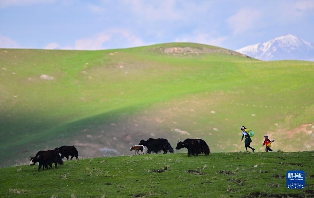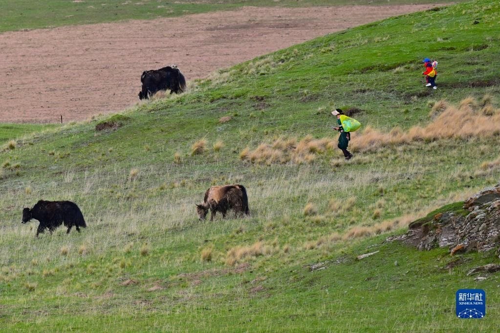 6月9日,在青海省黃南藏族自治州澤庫縣的高原草原上,當?shù)啬撩裨诜拍痢?