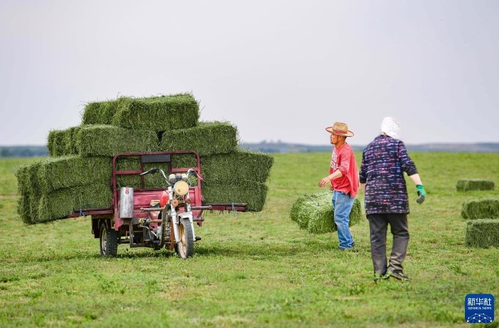 進入6月,內(nèi)蒙古自治區(qū)鄂爾多斯市鄂托克前旗大面積種植的紫花苜蓿進入了成熟收獲期,當(dāng)?shù)胤N植戶搶抓晴好天氣展開收割,確保穩(wěn)產(chǎn)豐收。近年來,該旗借助高效節(jié)水技術(shù),持續(xù)打造優(yōu)質(zhì)牧草基地,種植紫花苜蓿、燕麥草等牧草品種,每年加工干草和青貯飼料超過80萬噸,除供應(yīng)當(dāng)?shù)仞B(yǎng)殖企業(yè)外還銷往內(nèi)蒙古各地,帶動了種植戶增收。