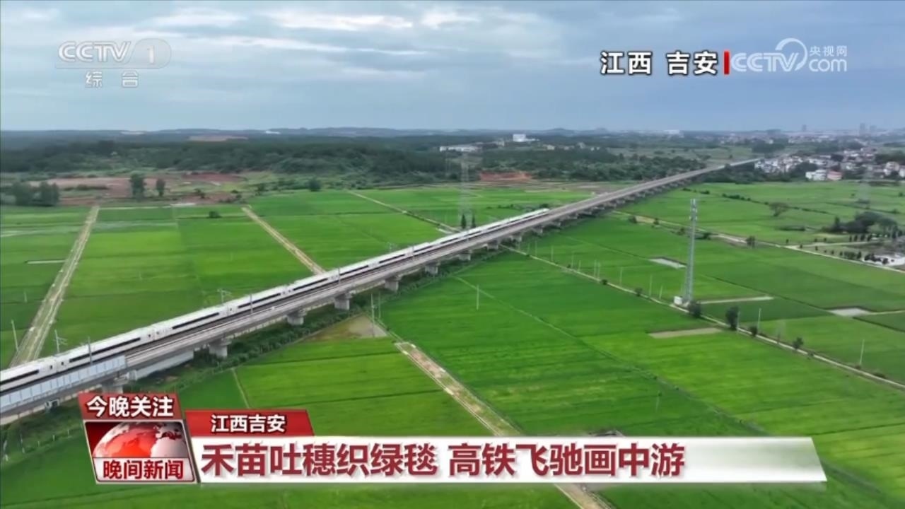 跟隨疾馳的高鐵,飛至江西吉安這片稻田的上空。早早種下的水稻,已經進入抽穗期。飛馳的高鐵從一塊塊綠毯中呼嘯而過,驚起層層稻浪。這是工業(yè)與農業(yè)的交響,這是快與慢的彼此致敬。再過二十多天,這片綠色的田野,將回饋黃澄澄、沉甸甸的稻谷。