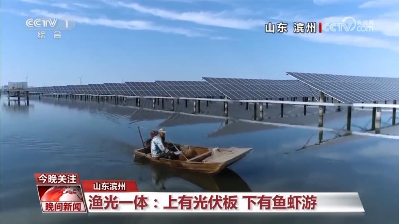 我們現(xiàn)在從陸地轉向水域,在山東濱州沾化的這個鹽田蝦養(yǎng)殖區(qū)里,蝦池上方是藍色光伏板,25度傾斜角的設計,既能達到最佳發(fā)電效果,又能為蝦池遮光、降溫。光伏矩陣下,漁民撐一葉小舟為蝦苗投喂餌料。每年,2000萬尾鹽田蝦從這里游上全國餐桌,近4億度清潔綠電并入電網。養(yǎng)殖業(yè)牽手新能源,奏出新時代的漁光曲。