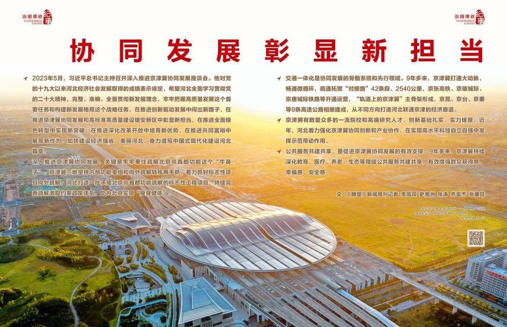 ◇2023年5月,習(xí)近平總書記主持召開深入推進(jìn)京津冀協(xié)同發(fā)展座談會(huì)。他對(duì)黨的十九大以來河北經(jīng)濟(jì)社會(huì)發(fā)展取得的成績(jī)表示肯定,希望河北全面學(xué)習(xí)貫徹黨的二十大精神,完整、準(zhǔn)確、全面貫徹新發(fā)展理念,牢牢把握高質(zhì)量發(fā)展這個(gè)首要任務(wù)和構(gòu)建新發(fā)展格局這個(gè)戰(zhàn)略任務(wù),在推進(jìn)創(chuàng)新驅(qū)動(dòng)發(fā)展中闖出新路子,在推進(jìn)京津冀協(xié)同發(fā)展和高標(biāo)準(zhǔn)高質(zhì)量建設(shè)雄安新區(qū)中彰顯新?lián)?dāng),在推進(jìn)全面綠色轉(zhuǎn)型中實(shí)現(xiàn)新突破,在推進(jìn)深化改革開放中培育新優(yōu)勢(shì),在推進(jìn)共同富裕中展現(xiàn)新作為,加快建設(shè)經(jīng)濟(jì)強(qiáng)省、美麗河北,奮力譜寫中國(guó)式現(xiàn)代化建設(shè)河北篇章。