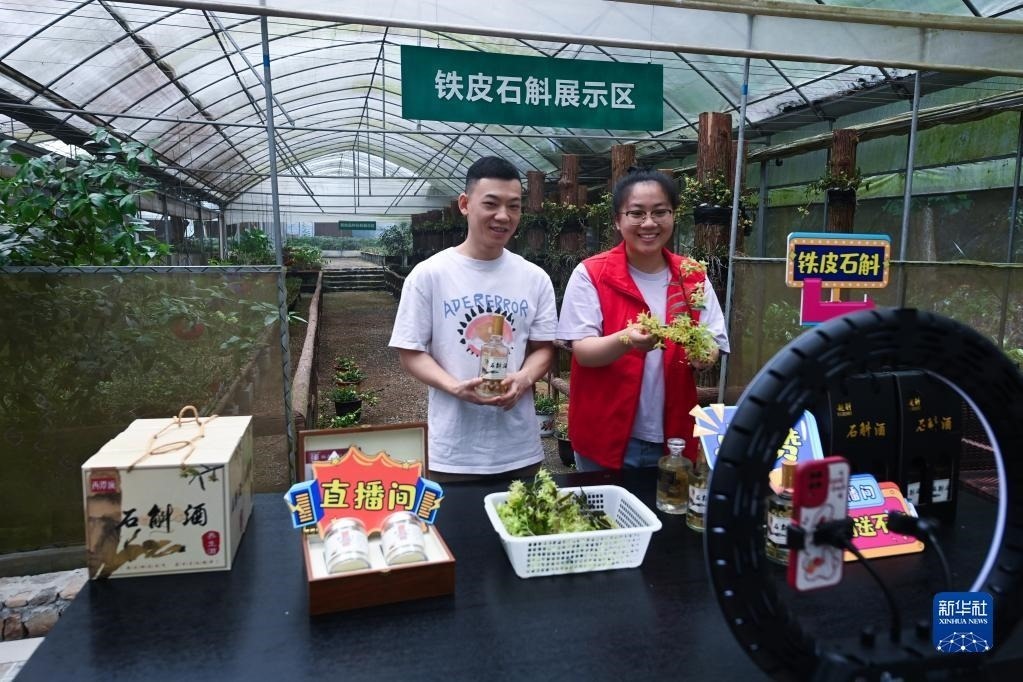 在浙江諸暨東白湖鎮(zhèn)的鐵皮石斛有機(jī)種植基地,東白湖鎮(zhèn)黨員志愿者(右)和基地負(fù)責(zé)人一起直播銷售鐵皮石斛花茶、鐵皮石斛酒等產(chǎn)品(6月8日攝)。近年來,東白湖鎮(zhèn)著力發(fā)展鐵皮石斛等特色農(nóng)業(yè)產(chǎn)業(yè),加快農(nóng)業(yè)數(shù)字化轉(zhuǎn)型,推進(jìn)農(nóng)特產(chǎn)品交易服務(wù)中心、惠農(nóng)綜合平臺以及直播經(jīng)濟(jì)的發(fā)展。新華社記者 徐昱 攝