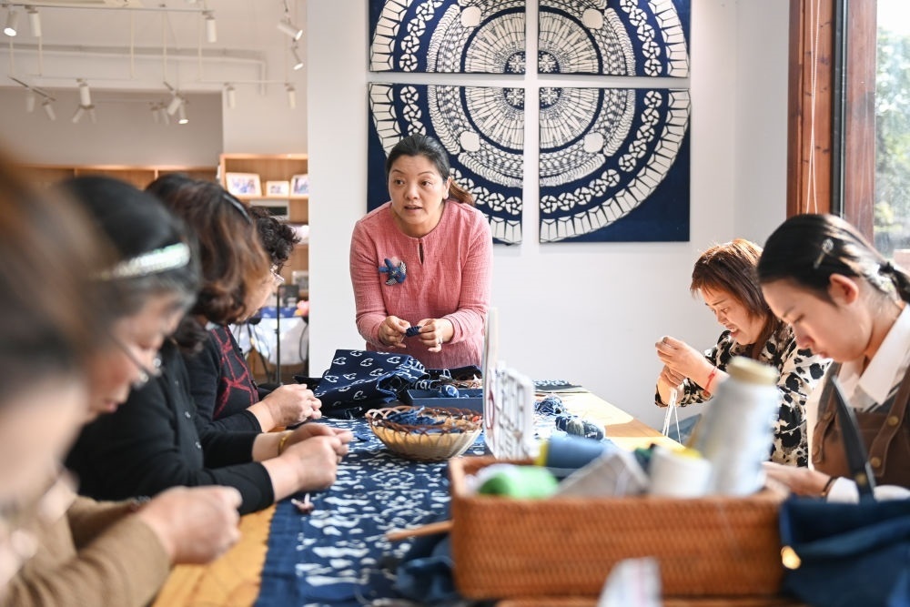 在奉化區(qū)西塢街道雷山村“七彩巧婦”共富工坊,寧波市非物質文化遺產藍印花布印染技藝代表性傳承人張劍峰(中)向村民演示手工飾品的制作方法(2023年3月8日攝)。新華社記者 黃宗治 攝