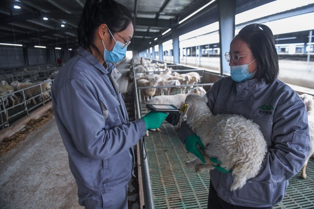 浙江省湖州市長興縣呂山鄉(xiāng)湖羊智慧循環(huán)產業(yè)園的工作人員在掃描湖羊幼仔耳朵上的數(shù)字芯片(2022年1月6日攝)。新華社記者 徐昱 攝
