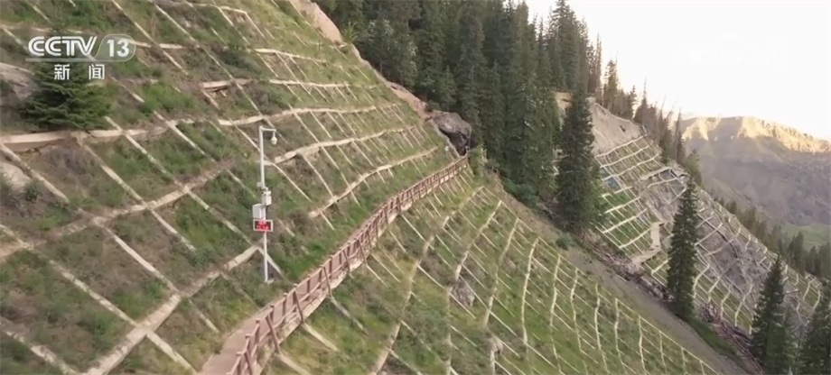天池的水來(lái)自于天山深處的冰川融水,由南向北形成多條瀑布、河流,一路向山下奔流,成為當(dāng)?shù)刂匾霓r(nóng)業(yè)灌溉水源,滋養(yǎng)著下游80多萬(wàn)畝土地。我們現(xiàn)在看到這些鋪在山野中的網(wǎng)格,就是當(dāng)?shù)卣谶M(jìn)行的生態(tài)修復(fù)與地質(zhì)災(zāi)害防治工程,人們?cè)谶@些網(wǎng)格間播撒草籽,來(lái)穩(wěn)定區(qū)域生態(tài)環(huán)境,有效防范地質(zhì)災(zāi)害的發(fā)生。