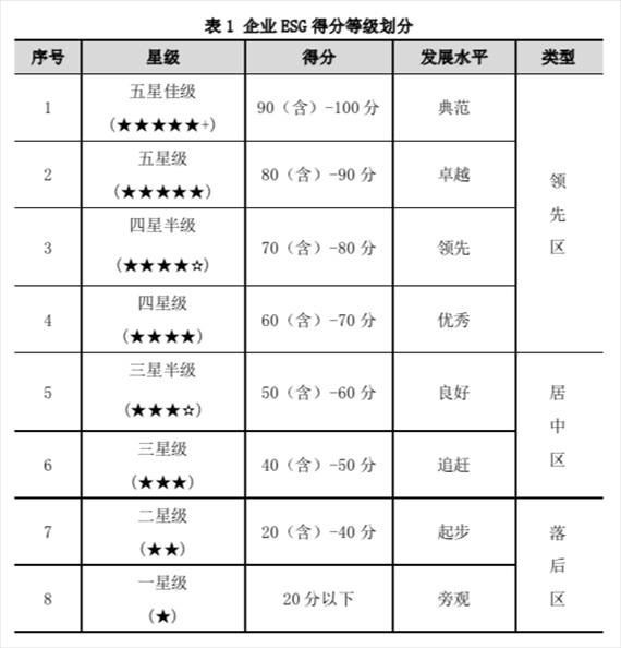 為直觀反映企業(yè)ESG水平,將ESG指數劃分為八個等級,分別為:五星佳級、五星級、四星半級、四星級、三星半級、三星級、二星級和一星級,各類企業(yè)對應的星級水平和ESG發(fā)展水平見表1。