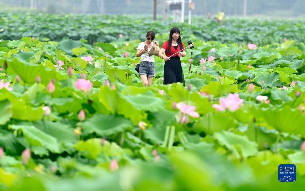 時(shí)下,廣西柳州市柳江區(qū)百朋鎮(zhèn)萬(wàn)畝荷塘里的各色荷花競(jìng)相綻放,吸引游客前來(lái)賞花游玩。新華社發(fā)(黎寒池 攝)