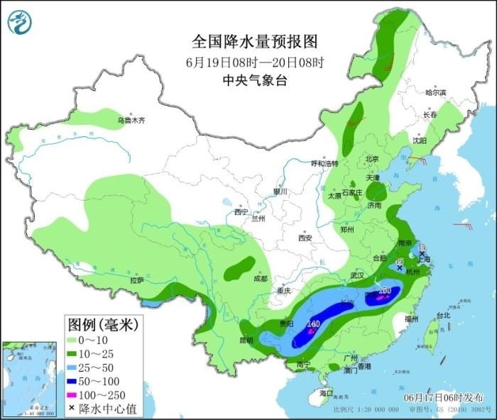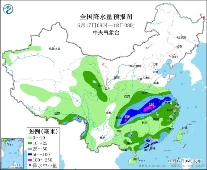 17日至19日,西南地區(qū)東部、江漢、江淮、江南、華南等地有大范圍較強(qiáng)降雨過(guò)程,部分地區(qū)有大到暴雨,局地大暴雨,并伴有短時(shí)強(qiáng)降水、雷暴大風(fēng)等強(qiáng)對(duì)流天氣。其中,6月17日08時(shí)至18日08時(shí),江淮大部、江漢大部、湖南北部、重慶中東部、貴州北部、廣西北部和南部沿海、廣東中南部、福建南部以及西藏東南部、云南西北部等地部分地區(qū)有大到暴雨,其中,湖北東部、重慶東南部、貴州東北部、廣東中南部等地部分地區(qū)有大暴雨(100~150毫米)。上述部分地區(qū)伴有短時(shí)強(qiáng)降水(最大小時(shí)降雨量20~60毫米,局地可超過(guò)70毫米),局地有雷暴大風(fēng)等強(qiáng)對(duì)流天氣。中央氣象臺(tái)6月17日06時(shí)繼續(xù)發(fā)布暴雨藍(lán)色預(yù)警。