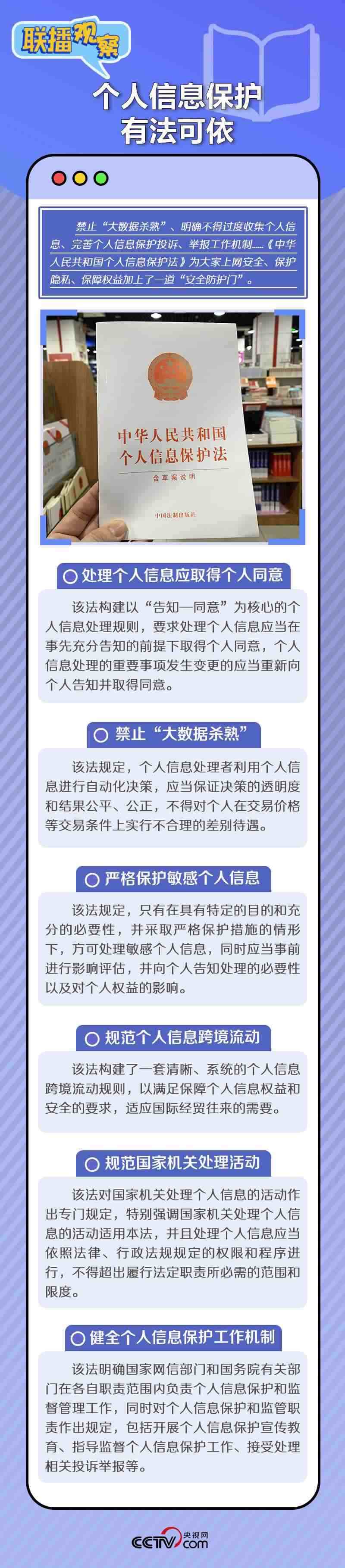 互聯(lián)網(wǎng)的普及,讓個(gè)人信息保護(hù)成為廣大網(wǎng)民關(guān)心的問題。習(xí)近平總書記始終把關(guān)乎人民幸福感、安全感的個(gè)人信息保護(hù)放在心上,明確要求保障個(gè)人信息安全,維護(hù)公民在網(wǎng)絡(luò)空間的合法權(quán)益。近年來,我國在相關(guān)立法保障方面做了哪些努力?個(gè)人信息保護(hù)取得哪些成果?央視網(wǎng)《聯(lián)播觀察》帶您一起了解。