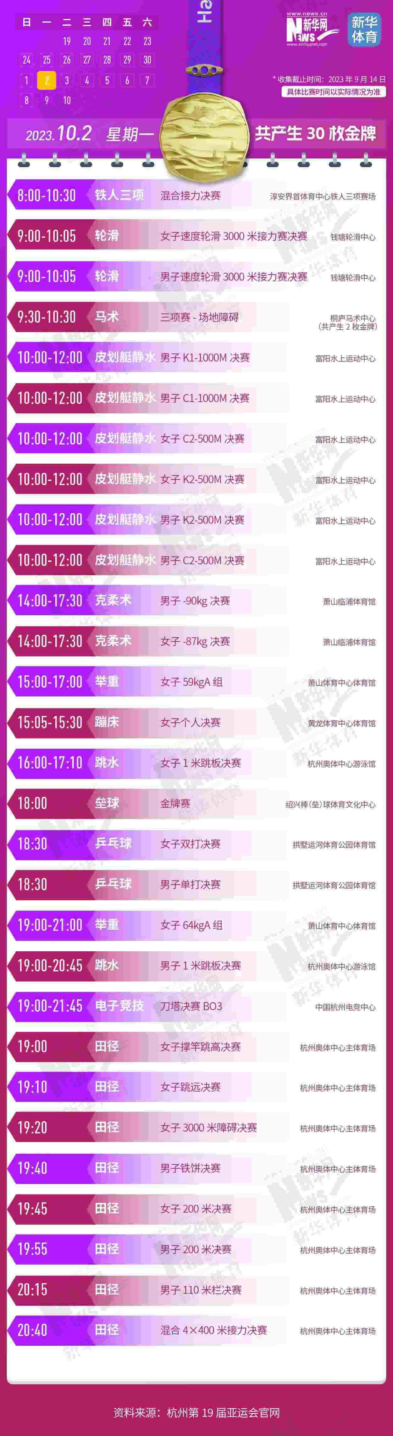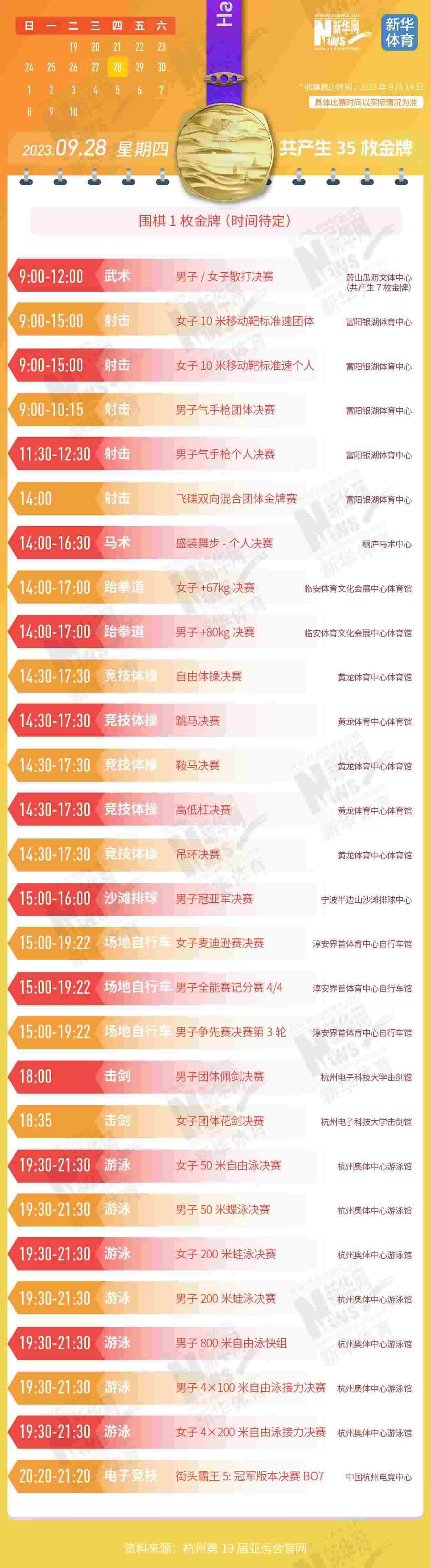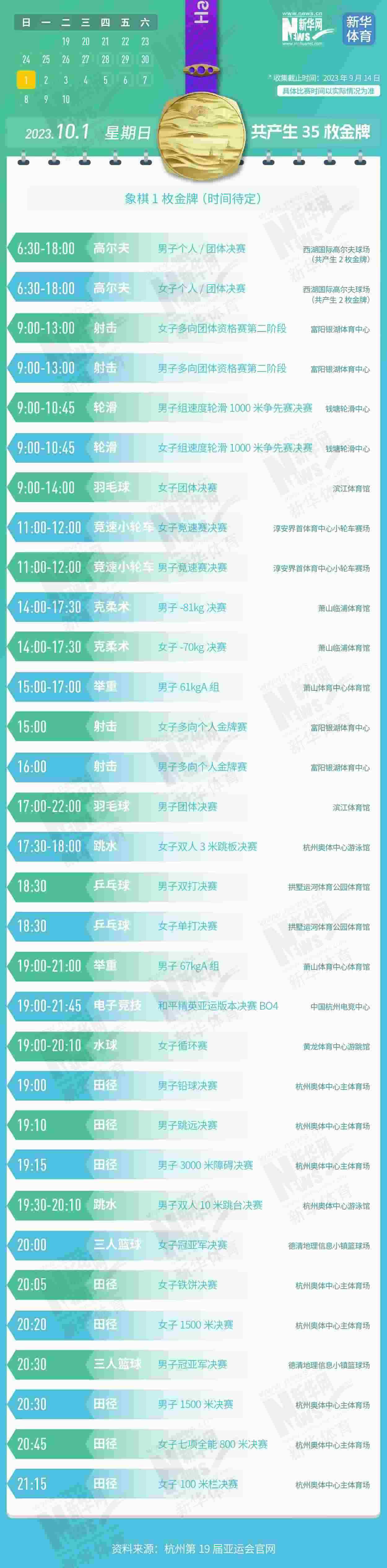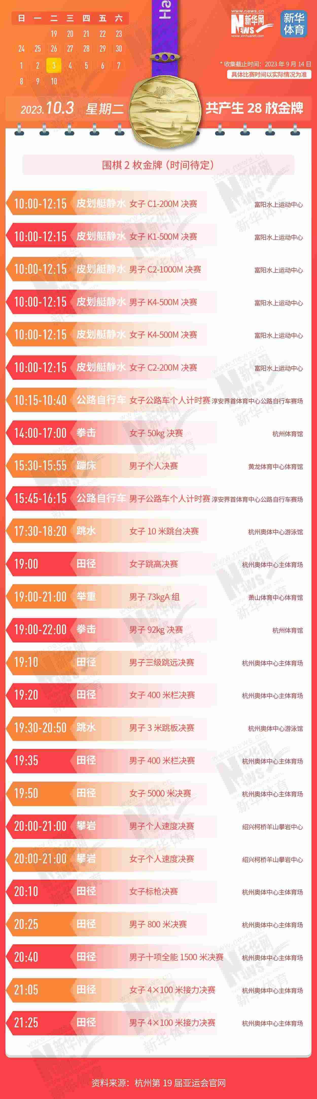 杭州第19屆亞運(yùn)會(huì)即將開(kāi)幕。本屆亞運(yùn)會(huì)將產(chǎn)生481枚金牌,快收藏這份金牌賽事日歷,助你精準(zhǔn)觀(guān)賽!