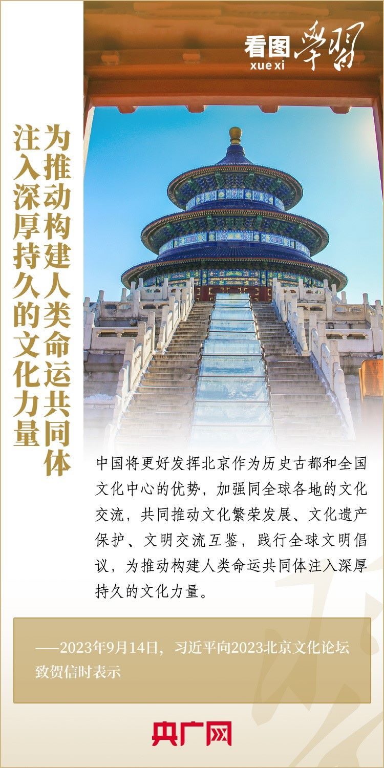 9月14日,以“傳承優(yōu)秀文化 促進(jìn)交流合作”為年度主題的2023北京文化論壇在北京開(kāi)幕。習(xí)近平主席向論壇致賀信表示,中國(guó)將更好發(fā)揮北京作為歷史古都和全國(guó)文化中心的優(yōu)勢(shì),加強(qiáng)同全球各地的文化交流,共同推動(dòng)文化繁榮發(fā)展、文化遺產(chǎn)保護(hù)、文明交流互鑒,踐行全球文明倡議,為推動(dòng)構(gòu)建人類命運(yùn)共同體注入深厚持久的文化力量。