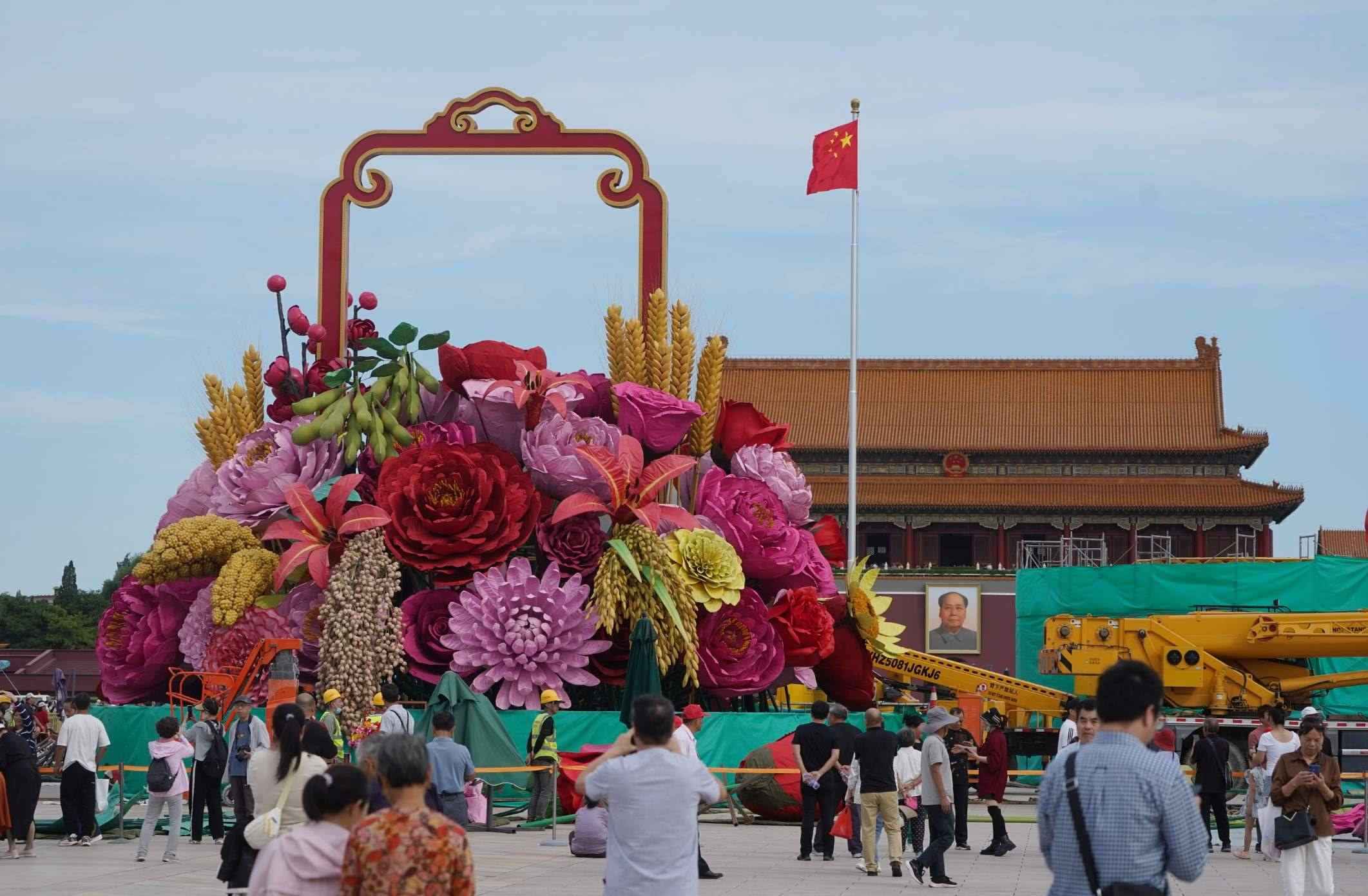 今年,天安門廣場(chǎng)中心的“祝福祖國(guó)”主題花壇以喜慶的花籃為主景?;@內(nèi)選取了擁有美好寓意的花卉和喜慶豐收的五谷(水稻、小麥、小米、黃米、大豆),體現(xiàn)花團(tuán)錦簇、五谷豐登。