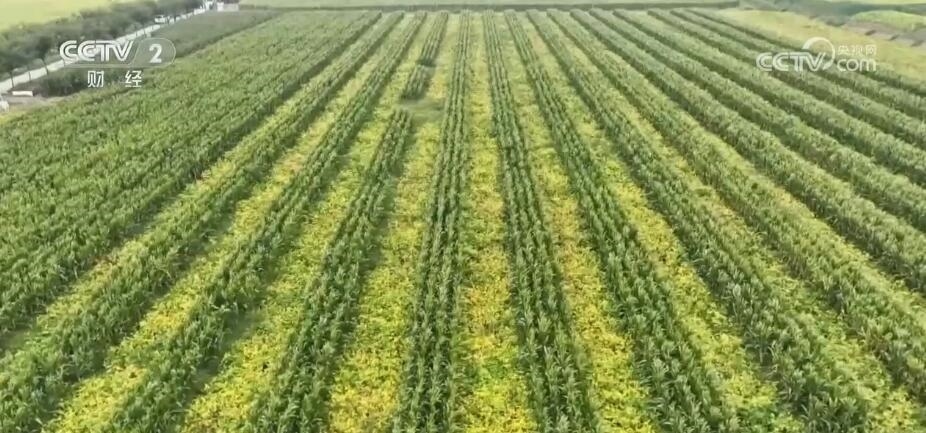 除了高密度種植,今年她家還有220畝采取了大豆玉米帶狀復合種植。你看對面的這片田就是,四行玉米間隔著六行大豆,這是按照當?shù)剞r機的大小和寬度調整的種植寬度,玉米喜光大豆耐蔭,一高一矮套種互不影響,同時又能更加土地的利用率。