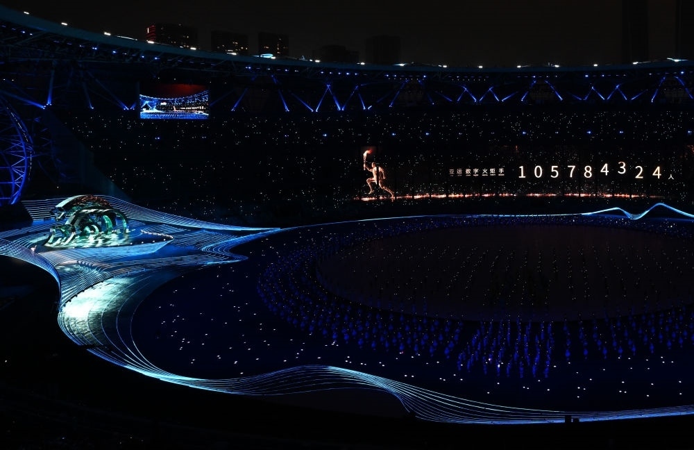 中國(guó)農(nóng)歷秋分節(jié)氣,杭州奧體中心體育場(chǎng)“大蓮花”燈光璀璨,萬(wàn)涓成水,奔涌成潮?!皵?shù)字火炬手”與游泳運(yùn)動(dòng)員汪順共同點(diǎn)燃了象征亞洲大團(tuán)結(jié)的體育之火,杭州第十九屆亞運(yùn)會(huì)開幕。