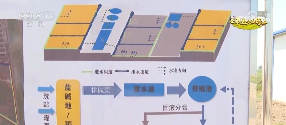 王永利說(shuō),通過(guò)淡水灌溉會(huì)將鹽堿田里的鹽和堿排出地塊,排出的鹽堿水通過(guò)一道道排水溝循環(huán)到蓄水池,最后被輸送到養(yǎng)殖池里養(yǎng)魚(yú),養(yǎng)魚(yú)產(chǎn)生的排泄物經(jīng)過(guò)過(guò)濾后回輸?shù)剿咎铮@樣的漁農(nóng)綜合利用模式讓鹽堿地不斷變好。