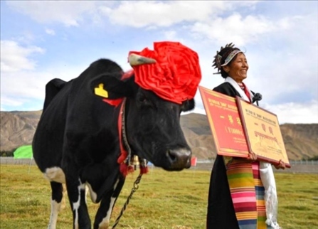 第六屆“聶雄杯”西藏高原·隆子黑白花優(yōu)質(zhì)奶牛競賽在西藏山南市隆子縣進(jìn)行決賽。按照早晚各一次現(xiàn)場擠奶稱總量計(jì)算、體形外貌和系譜檔案三條指標(biāo)進(jìn)行評比,一頭名叫“扎西”的奶牛奪冠。