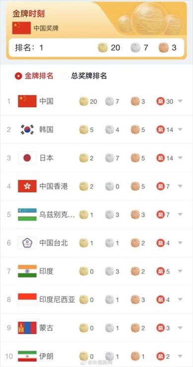 ·杭州亞運(yùn)會首日中國隊(duì)斬獲20金7銀3銅,位列獎牌榜第一名。