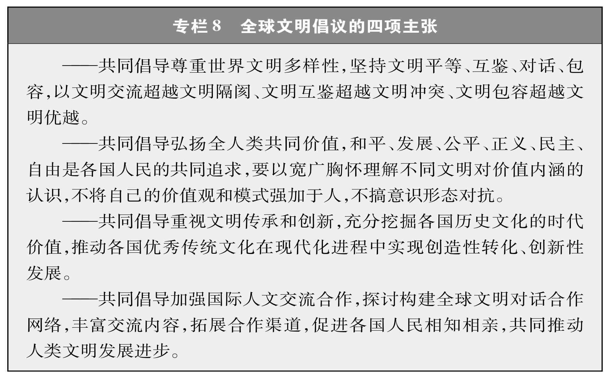 ——中國提出全球文明倡議,共同倡導尊重世界文明多樣性,共同倡導弘揚全人類共同價值,共同倡導重視文明傳承和創(chuàng)新,共同倡導加強國際人文交流合作。全球文明倡議向全世界發(fā)出增進文明交流對話、在包容互鑒中促進人類文明進步的真摯呼吁,為推動構(gòu)建人類命運共同體注入了精神動力。