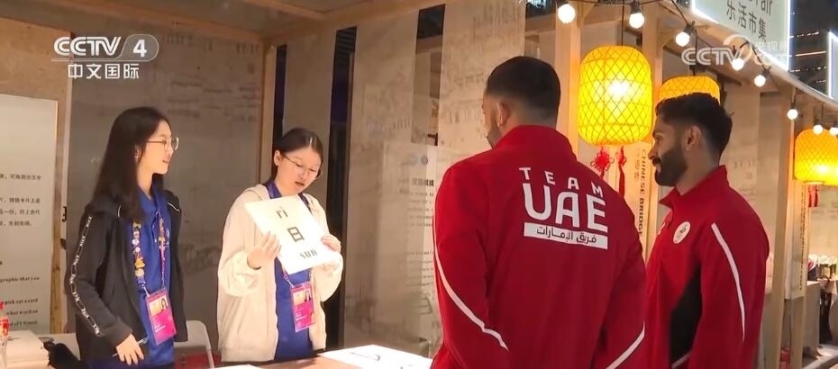 阿拉伯聯(lián)合酋長國的擊劍隊隨隊官員們也在文化市集上興致勃勃地體驗甲骨文猜字謎游戲。