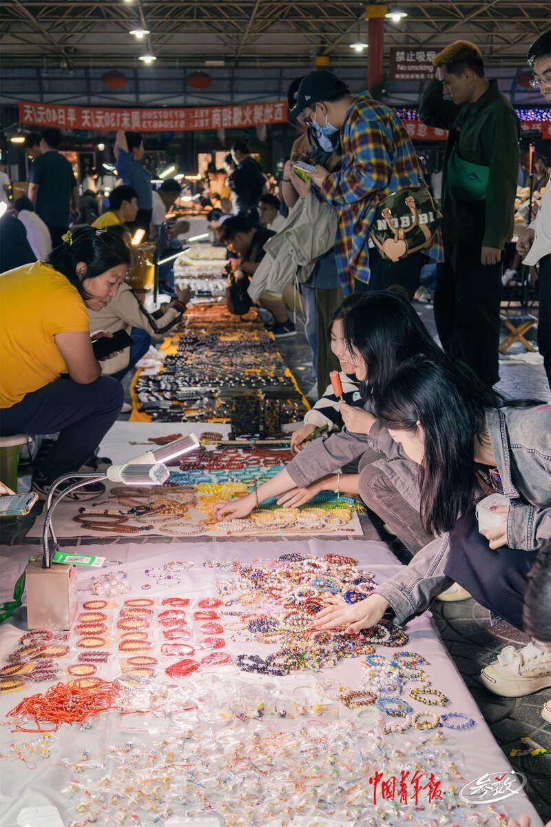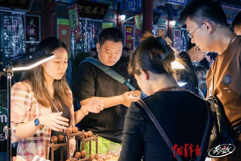 夜幕降臨,北京潘家園舊貨市場內(nèi)的周三夜場開啟,攤位上亮起了一盞盞照明的小燈,很多年輕人正在攤位前選購商品。實(shí)習(xí)生 邱嵐/攝