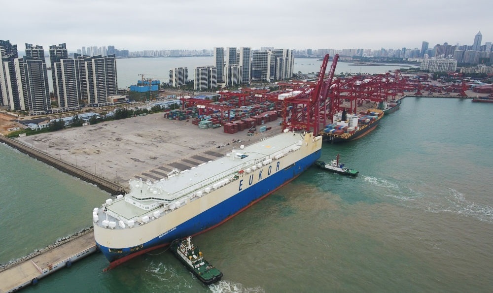 2020年2月16日,滾裝貨船“勞拉”輪駛?cè)牒?谛阌⒏郏o人機(jī)照片)。這是海南自貿(mào)區(qū)政策實(shí)施后的首艘汽車外貿(mào)船。新華社記者 楊冠宇 攝