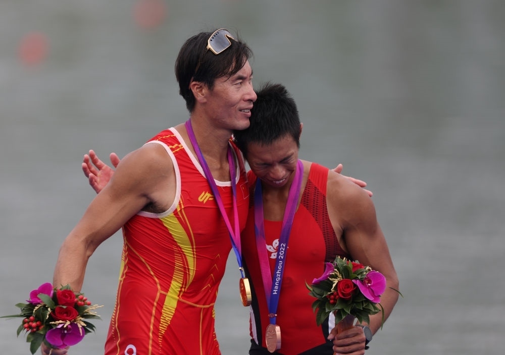 9月25日,冠軍中國(guó)選手張亮(左)與季軍中國(guó)香港選手趙顯臻在男子單人雙槳頒獎(jiǎng)儀式后擁抱致意。