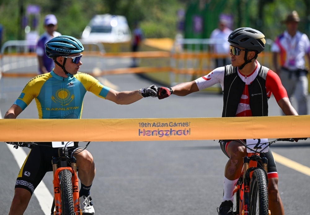 9月25日,哈薩克斯坦選手丹尼斯·謝爾吉延科(左)和新加坡選手賓·盧克曼·里亞德·哈基姆在山地自行車男子奧林匹克越野賽出發(fā)前相互致意。