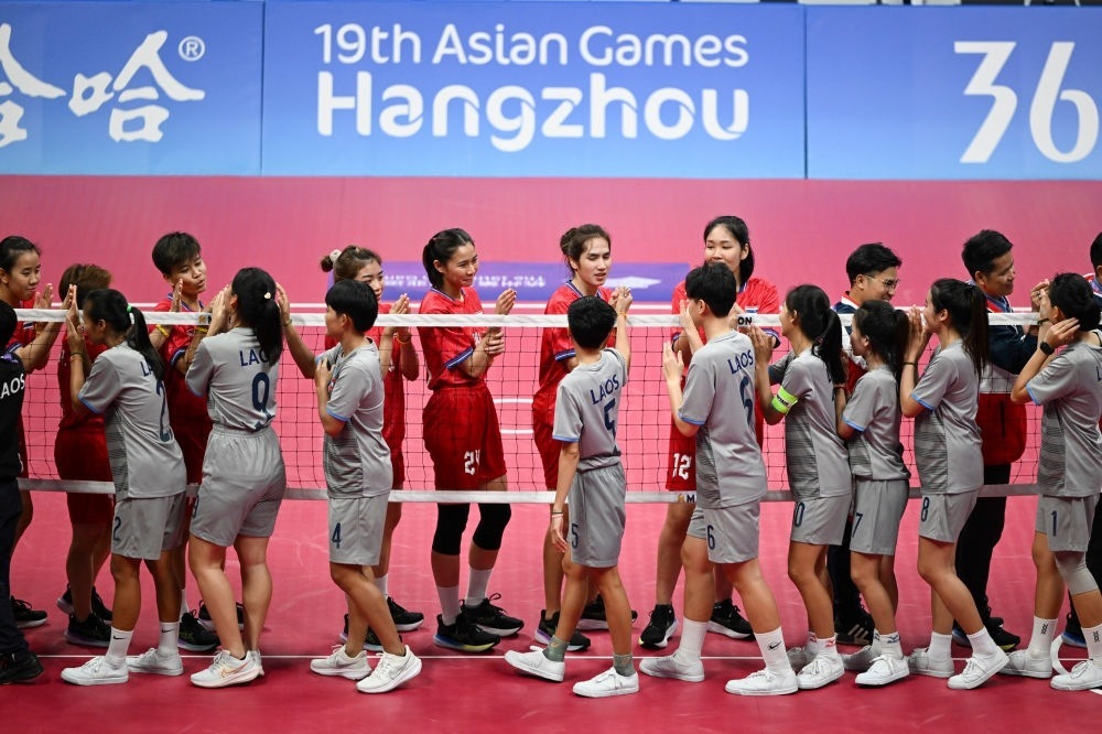 9月28日,泰國(guó)隊(duì)和老撾隊(duì)(前)在藤球女子單組團(tuán)體半決賽后互相致意。