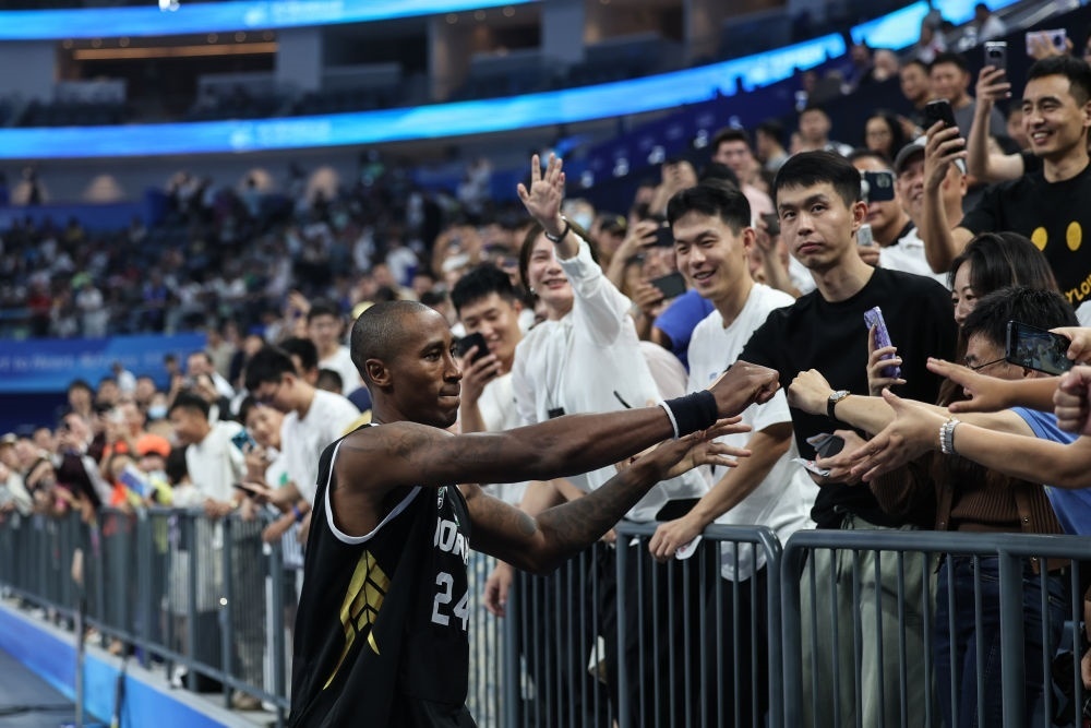 9月28日,約旦隊(duì)球員倫達(dá)·杰斐遜籃球男子預(yù)賽C組后與觀眾互動(dòng)。