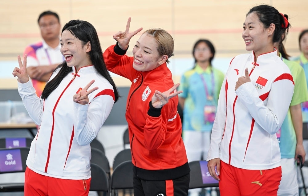 9月27日,冠軍日本選手佐藤水菜(中)、亞軍中國(guó)選手王麗娟(左)、季軍中國(guó)選手張琳茵在場(chǎng)地自行車女子凱林賽頒獎(jiǎng)等候區(qū)合影。