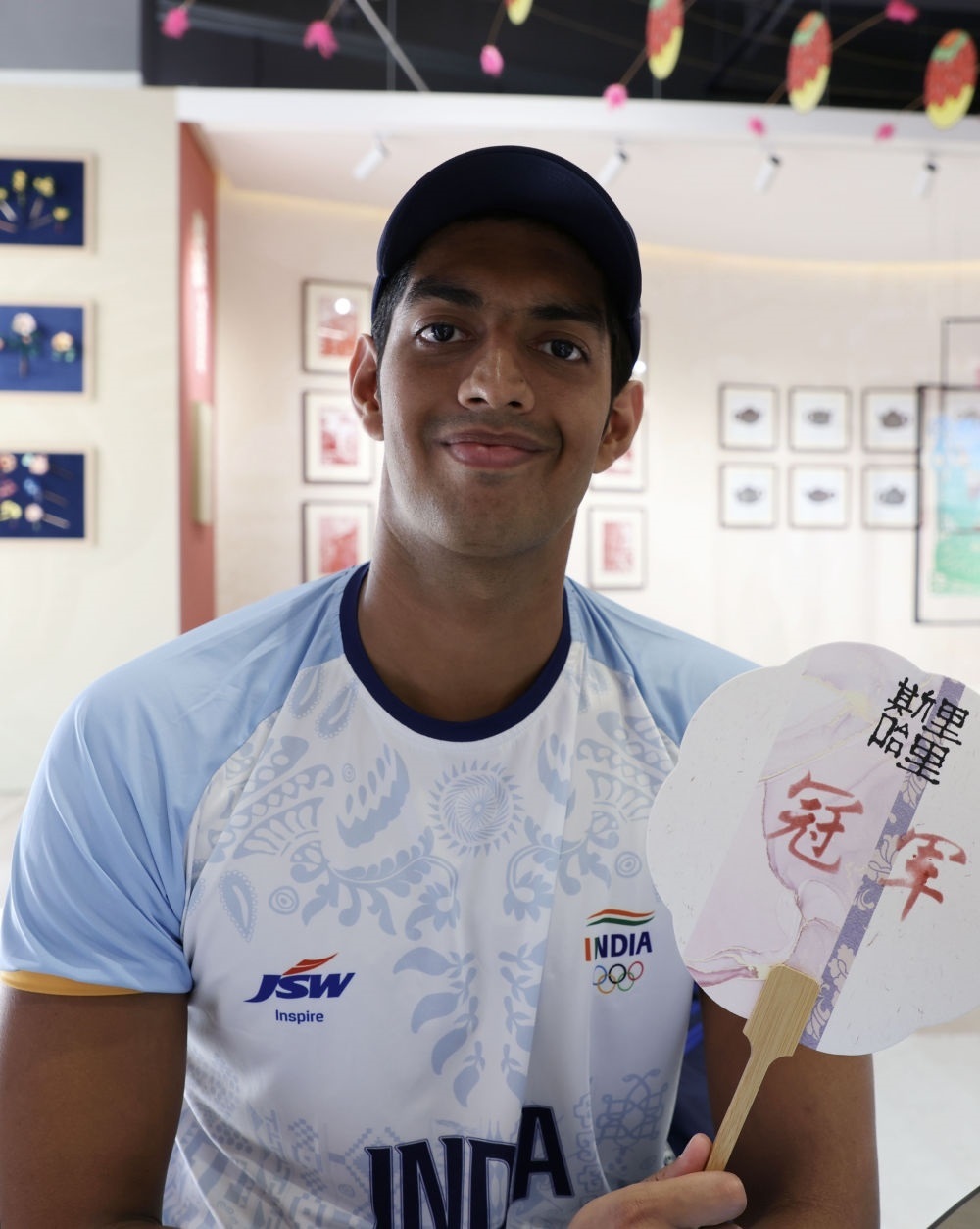 9月29日,馬爾代夫羽毛球運(yùn)動(dòng)員穆罕默德·阿杰凡·拉希德(左)在亞運(yùn)村樂活集市與工作人員合影留念。