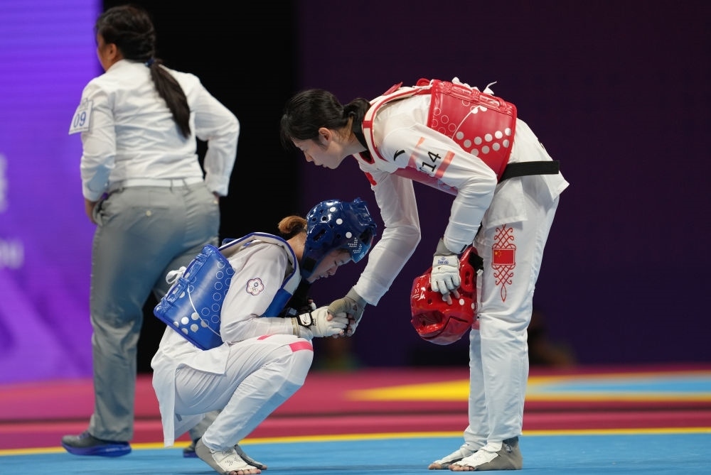 9月27日,宋潔(右)與張芮恩在跆拳道女子67公斤級(jí)1/4決賽后握手致意。