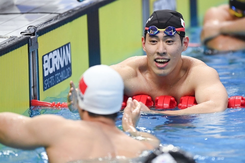 9月28日,中國(guó)隊(duì)選手在男子4X100米自由泳接力決賽后與韓國(guó)隊(duì)和日本隊(duì)選手致意。