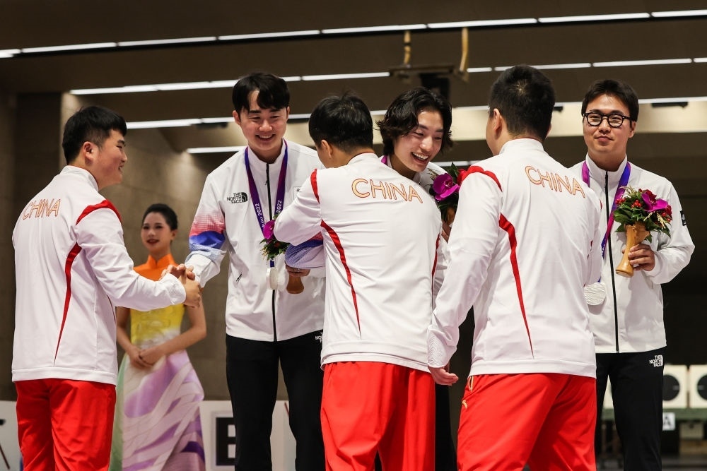 9月25日,冠軍中國(guó)隊(duì)選手李越宏(左三)、劉楊攀(左一)、王鑫杰(右二)在男子25米手槍速射團(tuán)體頒獎(jiǎng)儀式上向亞軍韓國(guó)隊(duì)致意。