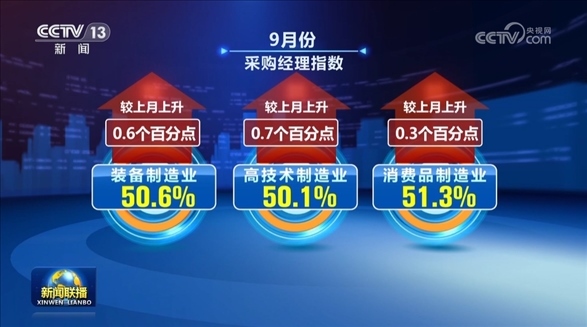 從重點行業(yè)來看,采購經理指數全面回升,經濟發(fā)展的協(xié)同性增強。9月份裝備制造業(yè)、高技術制造業(yè)和消費品制造業(yè)采購經理指數分別為50.6%、50.1%和51.3%,較上月分別上升0.6、0.7和0.3個百分點。