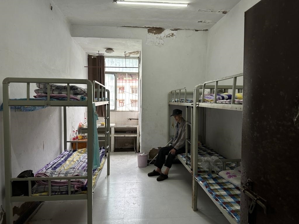 太白西村4組村民譚建和老爺爺行動不便,坐在鋪著干凈格子床單的宿舍床上望向窗外?!扒疤煜挛纾鐓^(qū)的車來接的我和老伴,安置點吃喝都好,宿舍住起來也挺舒服。兒子們擔心我,他們過不來,一天就打好幾通電話,我說都好著呢、好著呢?!弊T爺爺說。