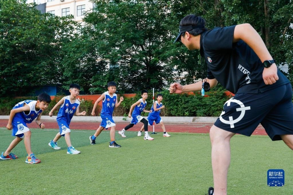 7月8日,在河南省駐馬店市汝南縣雙語學(xué)校,來自湖南大學(xué)的志愿者帶領(lǐng)孩子們一起做運動。