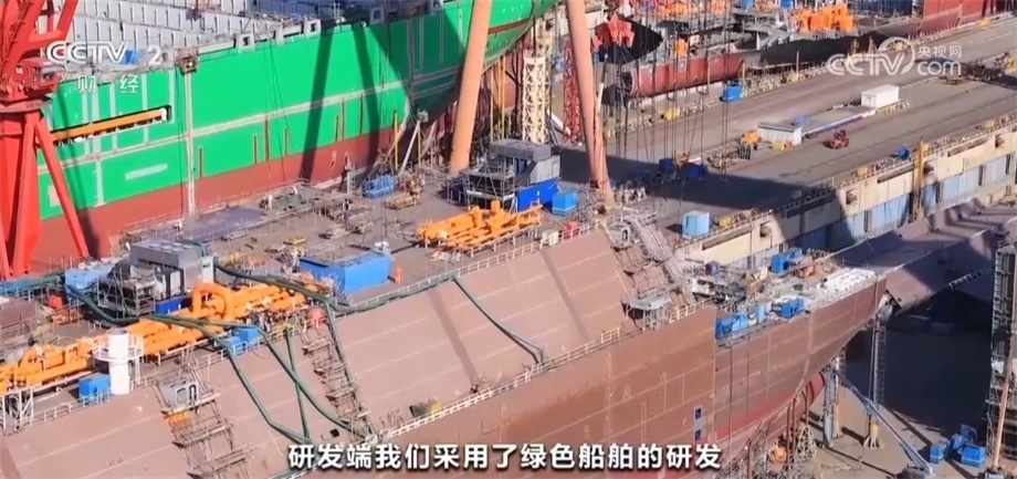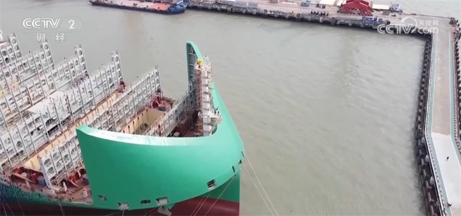 總臺央視記者 孟湛東:我現(xiàn)在是在中國船舶滬東中華造船廠的一艘13000箱的雙燃料集裝箱船上。這艘船除了使用傳統(tǒng)的石油燃料之外,還引入了液化天然氣,可以直接降低28%以上的溫室氣體排放。除此之外,在船頭還有一個獨特的設計,各位可以看到一個綠色的防風罩,工人們親切地稱它“綠頭怪”,這樣的設計可以讓船舶在正常行駛當中降低2%左右的燃料消耗。