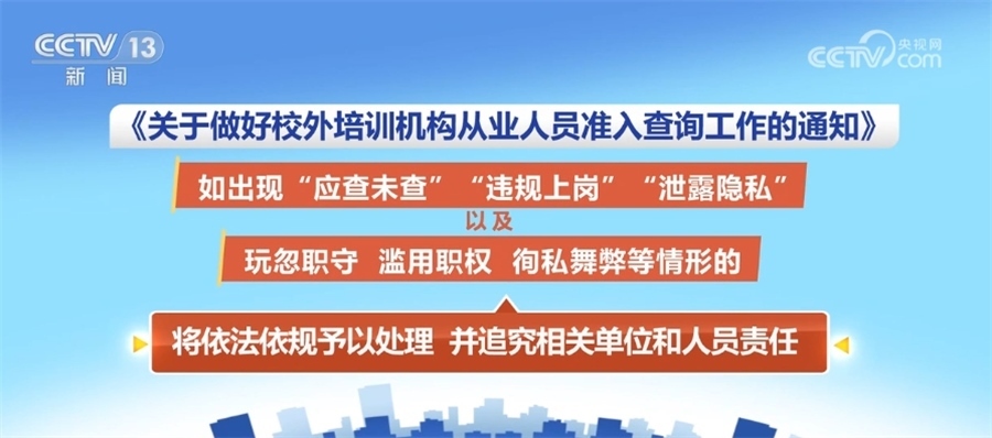此外,《通知》強(qiáng)調(diào)嚴(yán)明查詢管理責(zé)任。各級(jí)教育部門和相關(guān)主管部門、校外培訓(xùn)機(jī)構(gòu)及其工作人員應(yīng)履行準(zhǔn)入查詢的法定職責(zé),如出現(xiàn)“應(yīng)查未查”“違規(guī)上崗”“泄露隱私”以及玩忽職守、濫用職權(quán)、徇私舞弊等情形的,將依法依規(guī)予以處理,并追究相關(guān)單位和人員責(zé)任。