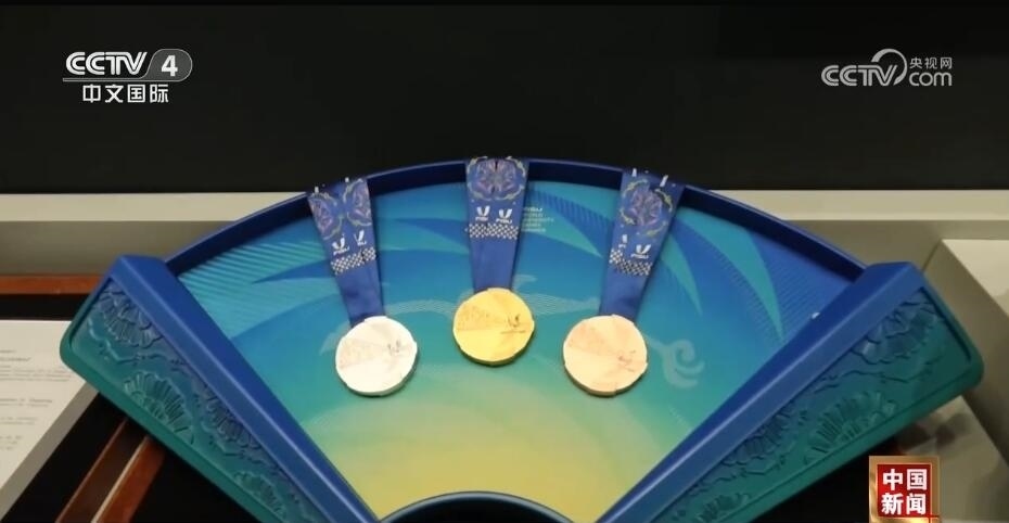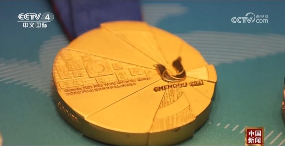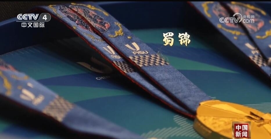 總臺記者 王豐:走進(jìn)成都大運(yùn)會博物館,最大的感受就是成都的元素?zé)o處不在。比如,我們剛一進(jìn)來,右手邊是成都大運(yùn)會的吉祥物蓉寶??赐耆貙殠鷣砜纯慈毓?,什么是蓉光呢?獎(jiǎng)牌代表了成都大運(yùn)會的榮譽(yù),“蓉”是取自成都的簡稱,包含了光榮和融合的含義,整個(gè)獎(jiǎng)牌的設(shè)計(jì)是呈現(xiàn)了不規(guī)則的圓形。另外,獎(jiǎng)牌的元素包含成都市的標(biāo)志——太陽神鳥。此外,在獎(jiǎng)牌的綬帶設(shè)計(jì)上首次采用了蜀錦的制作工藝,實(shí)際上也是非物質(zhì)文化遺產(chǎn)活化利用的非常好的案例。