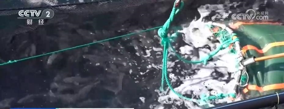 在煙臺長島南隍城海域,隨著經(jīng)海系列深水網(wǎng)箱里魚類的成熟,一場在大海上的收獲正在進(jìn)行。起降機(jī)將一個(gè)個(gè)裝滿魚兒的巨大網(wǎng)兜轉(zhuǎn)移到運(yùn)輸船上,2.5萬尾近4萬斤的成品黑鲪魚,將從這里銷往全國各地。