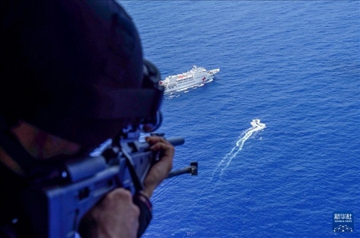 7月10日,中國海軍“和平方舟”號醫(yī)院船在太平洋上組織反恐反海盜演練。這是空中打擊組進行火力支援。