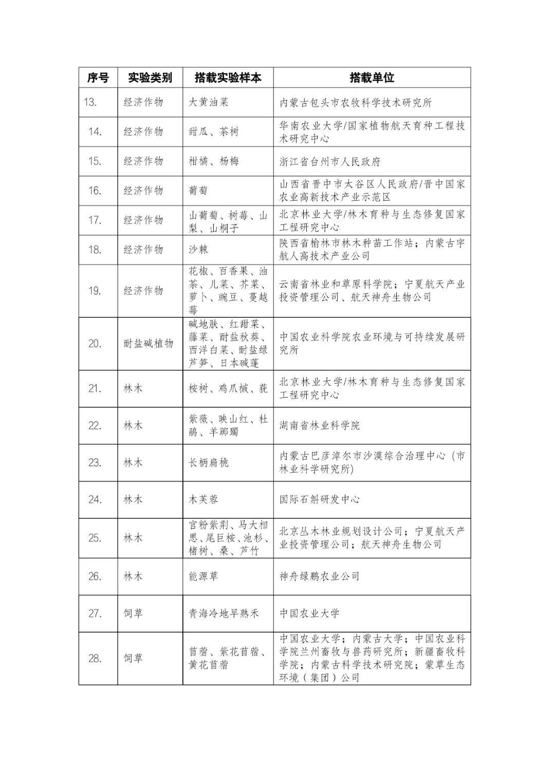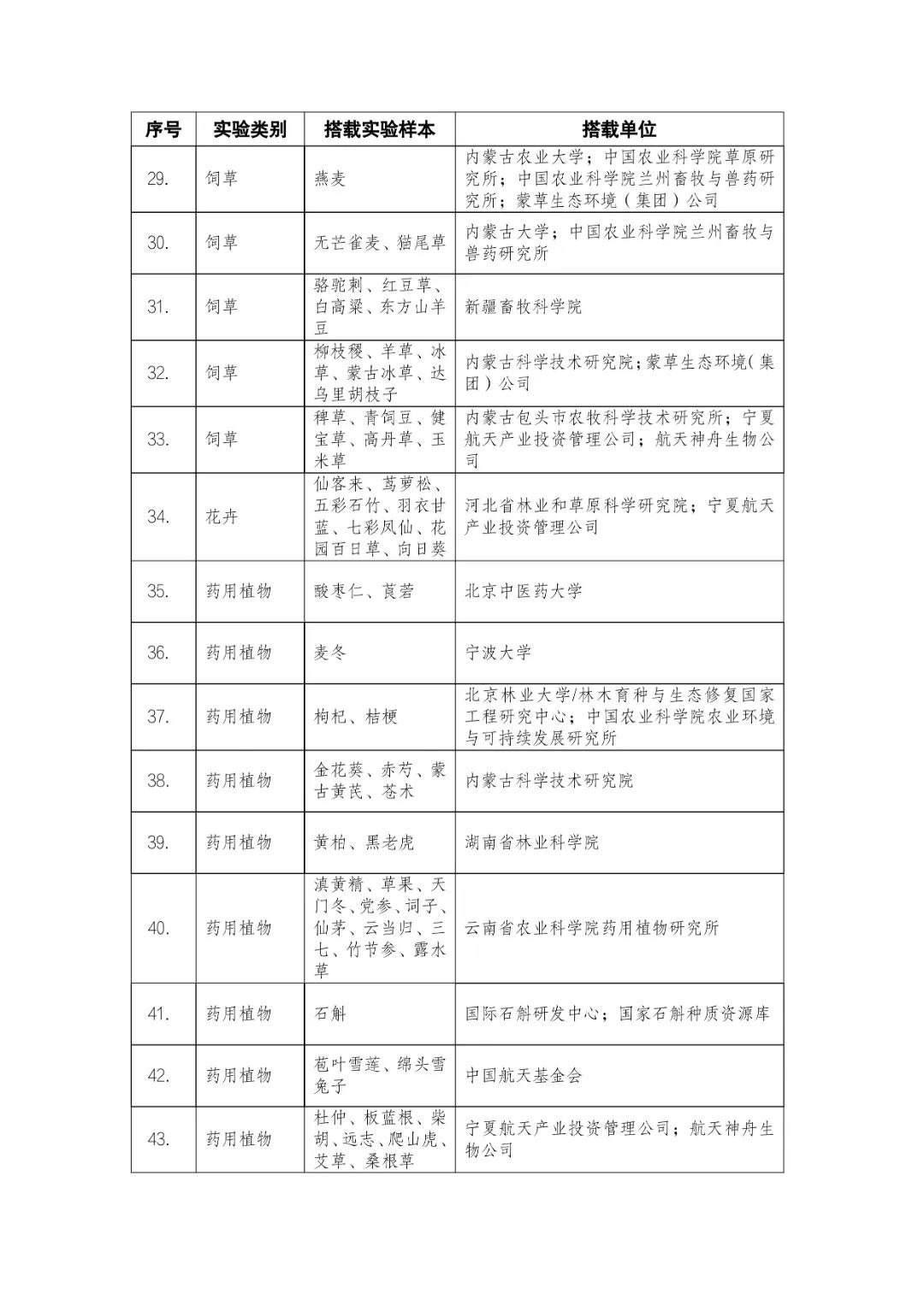 載人航天工程立項實施以來,始終注重提升工程綜合效益,致力服務(wù)國家經(jīng)濟(jì)社會發(fā)展。在工程歷次飛行任務(wù)中,均安排了航天育種搭載實驗項目。從神舟十六號載人飛船開始,中國載人航天工程辦公室向社會公開征集航天育種搭載實驗項目,于3月23日在工程官網(wǎng)發(fā)布《關(guān)于征集神舟系列載人飛船航天育種實驗項目的機(jī)會公告》,同時在工程官網(wǎng)開辟“航天育種搭載實驗”管理平臺,接受搭載需求單位申報實驗項目。辦公室組織專家對申報項目進(jìn)行評審,遴選出53個單位的136種份航天育種實驗材料實施搭載。包括農(nóng)作物47份(糧食作物種子12份、經(jīng)濟(jì)作物種子28份、耐鹽堿植物7份);林草、花卉和藥用植物76份(林木17份、飼草21份、花卉7份、藥用植物31份);微生物和其它13種(農(nóng)業(yè)微生物菌種2種、工業(yè)微生物菌種3種、食用菌3種、藻類和苔蘚5種)(清單附后)。