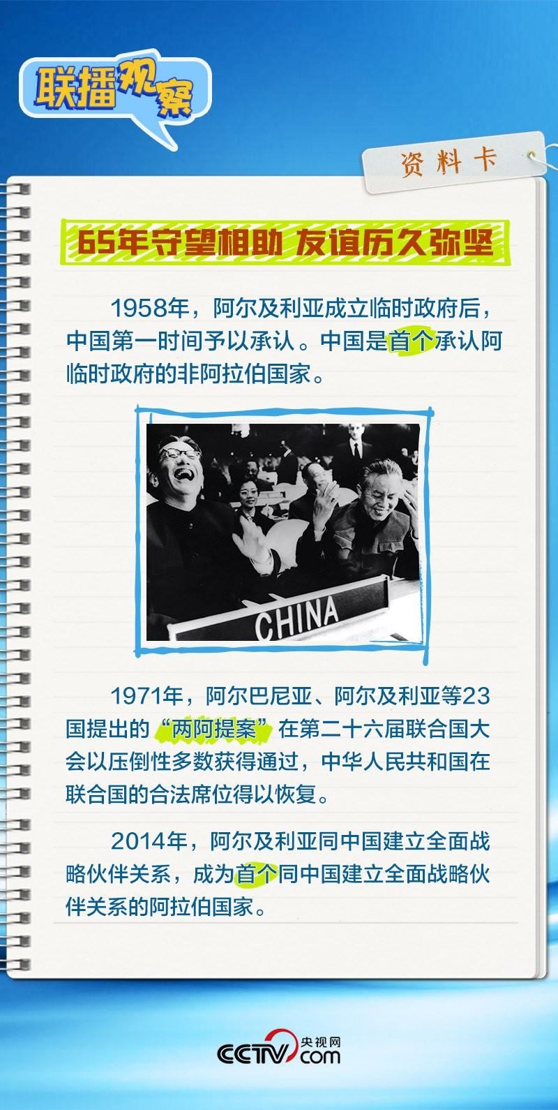 會(huì)談中,習(xí)主席特別提到,今年是中國(guó)向阿爾及利亞派遣醫(yī)療隊(duì)60周年,并稱贊此舉樹立了“中阿友誼的豐碑”。中阿傳統(tǒng)友誼深厚,兩國(guó)始終相互尊重、平等相待、彼此支持,締造了一段段友好交往的佳話。