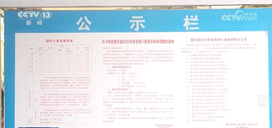 記者在這家糧食儲備庫的公示欄里看到了一份《收購唐河縣受損小麥質(zhì)價標準調(diào)整的通知》,里面明確了受損小麥的收購價格是1.15元每斤,而這個價格只比正常小麥收購價1.4元左右低了0.3元。這張通知的落款日期是6月4日,而當(dāng)?shù)剞r(nóng)戶普遍是在6月3日收完糧食,這也在第一時間讓老百姓吃下了“定心丸”。