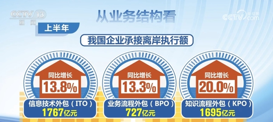 數(shù)據(jù)顯示,2023年上半年,我國(guó)企業(yè)承接服務(wù)外包合同額10917億元人民幣,執(zhí)行額7400億元,同比分別增長(zhǎng)10.6%和14.7%。從業(yè)務(wù)結(jié)構(gòu)看,上半年,我國(guó)企業(yè)承接離岸信息技術(shù)外包(ITO)、業(yè)務(wù)流程外包(BPO)和知識(shí)流程外包(KPO)執(zhí)行額分別為1767億元、727億元和1695億元,同比分別增長(zhǎng)13.8%、13.3%和20.0%。其中,信息技術(shù)解決方案服務(wù)、管理咨詢服務(wù)、互聯(lián)網(wǎng)營(yíng)銷推廣服務(wù)等離岸服務(wù)外包業(yè)務(wù)增速較快。