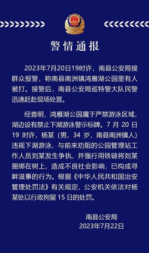 ·男子下湖游泳違規(guī)、將勸阻人員鎖在樹上,湖南益陽市南縣警方通報。