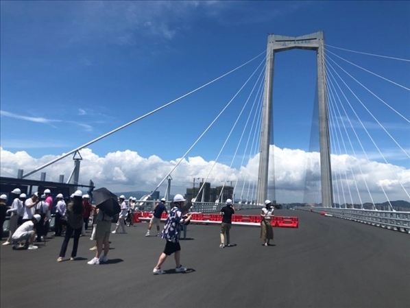 在中山市深中通道中山大橋段采風(fēng)點(diǎn),采風(fēng)團(tuán)成員踏上已完成鋪裝的橋面,近距離一睹大橋“英姿”。在建的深中通道連接廣東省境內(nèi)的深圳、中山兩市,全長(zhǎng)約24公里。建成通車(chē)后,從中山到深圳開(kāi)車(chē)可在半小時(shí)內(nèi)到達(dá),大大縮短了中山至深圳、香港等地的通行距離。這一建設(shè)工程,對(duì)于深化打造珠江口岸“黃金內(nèi)灣”的生活圈,推動(dòng)粵港澳大灣區(qū)城市群融合發(fā)展具有重要意義。目前,深中通道建設(shè)已進(jìn)入收尾階段,預(yù)計(jì)2024年通車(chē)。