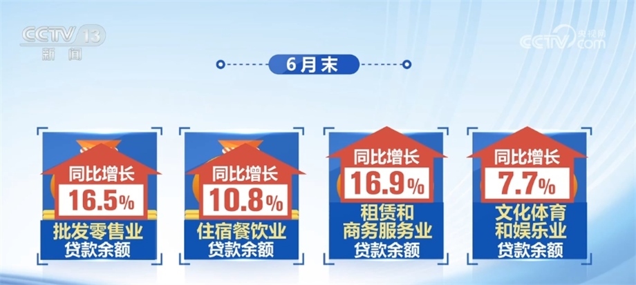 數(shù)據(jù)顯示,6月末,批發(fā)零售業(yè)、住宿餐飲業(yè)、租賃和商務服務業(yè)、文化體育和娛樂業(yè)貸款余額同比分別增長16.5%、10.8%、16.9%、7.7%,信用卡、汽車和其他綜合消費貸款比年初增加7100多億元,有力支持了相關(guān)領域消費恢復發(fā)展。