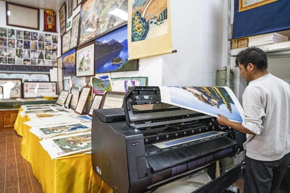 ↑在西藏米林市羌納鄉(xiāng)西嘎門巴村,南迦巴瓦童螺嘎布工藝品農(nóng)民專業(yè)合作社的工作人員在藏紙上印刷圖案(7月26日攝)。